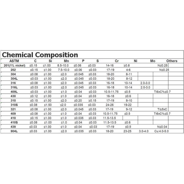 | Material | 304, 304L, 316, 316L, 201, 202, 409L, 410, 430 |